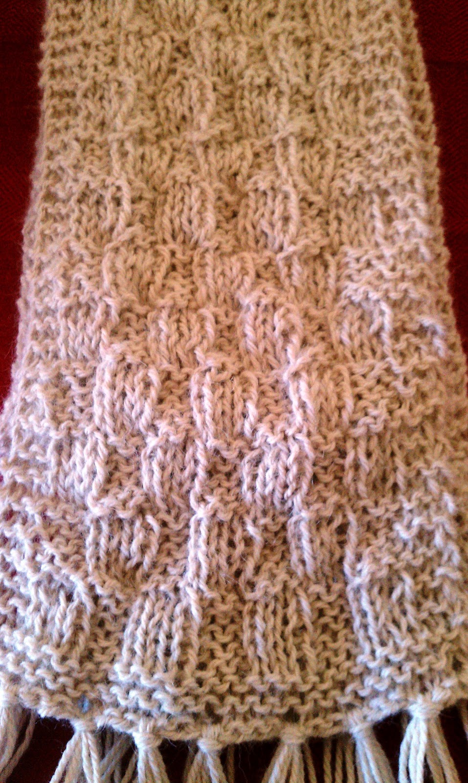 cut 18 sets of 3 strands approx 12 inches long or however long you want - use crochet hook to add 9 sets of fringe on each end of scarf.